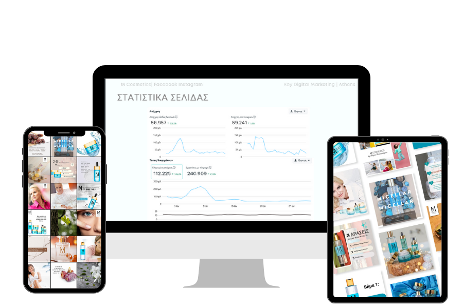 - Δημιουργία εκστρατειών Facebook με στόχο πωλήσεις, προβολή προϊόντων, remarketing πελατών που έχουν αλληλεπιδράσει με την επιχείρηση.